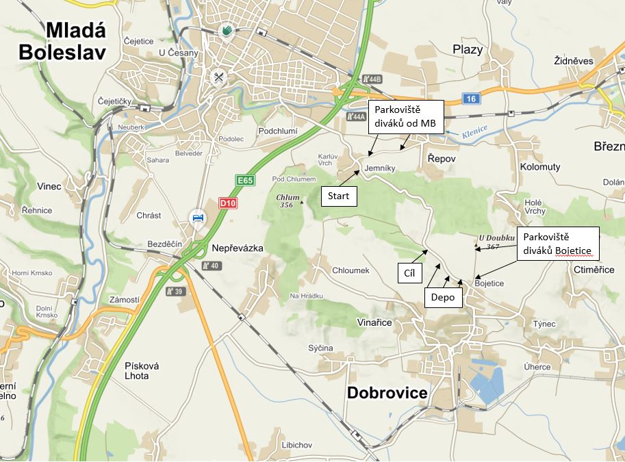 PARKOVIŠTĚ DIVÁKŮ - pro diváky budou připravena dvě odstavná parkoviště. První ve směru od Mladé Boleslavi bude situováno na spojovací komunikaci mezi Jemníky a Řepovem a druhé ve směru od obce Bojetice na panelové cestě směřující k lesu nazývajícímu se U Doubku.