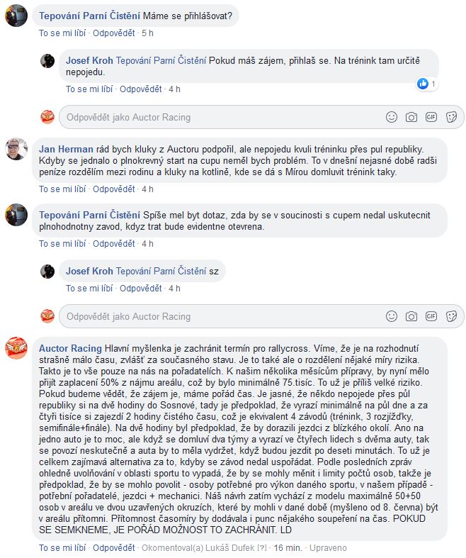 Plně chápeme současný nelehký stav, ale snažíme se jako je tomu v jiných sportech za aktuálních podmínek rozjet závody. Chápeme samozřejmě i pohled jezdců, že mají prostě obavy o své zdraví. To my samozřejmě také, ale jednou to musí skončit. Porovnání standardního chodu z pohledu závod - jezdci + mechanici - pořadatelé (bez diváků=např.odělené depo) versus plný hobby či supermarket si vyjma rozpravy s jezdci zase z pohledu nějakého velkého sdružování se rozodně s těmito podniky nemůže porovnávat.